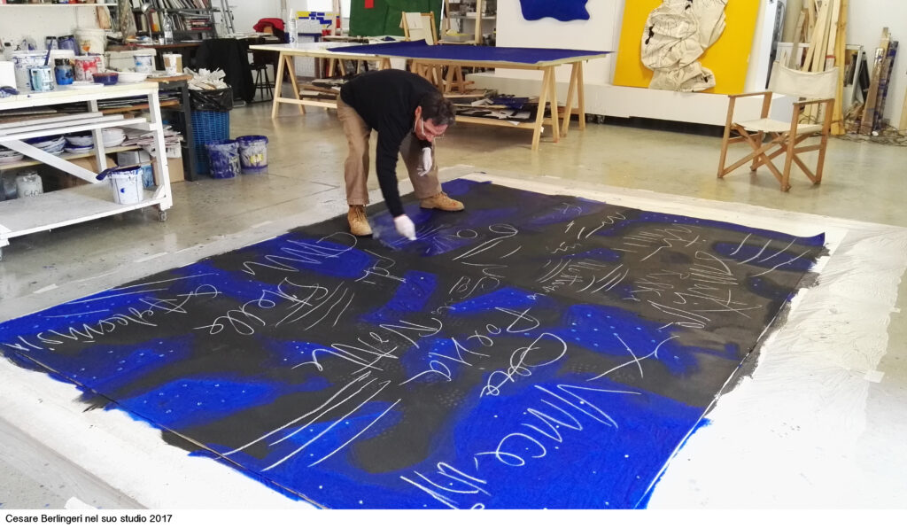 “L’arte è iniziata con un tizzone e finirà con un tizzone”, scrive Berlingeri. Grappoli di astri e graffiti si incidono nell’oscurità di un cielo stellato: come nella notte dei tempi. Poi il buio della piega avvolge ogni cosa.